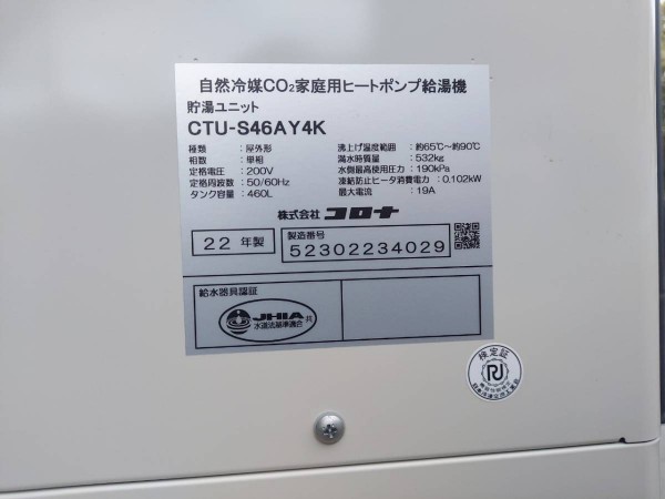 大分市入蔵 コロナ自然冷媒CO2家庭用ヒートポンプ給湯機 貯湯ユニットCTU-S46AY4K エコキュート交換工事|大分県のエコキュート専門交換工事店|大分エコキュート交換ショップ補助金対応可能