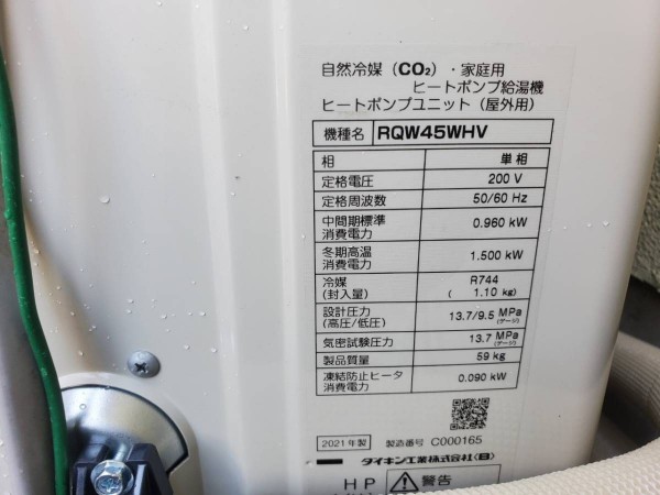 臼杵市荒田 ダイキン自然冷媒CO2・家庭用ヒートポンプ給湯機 ヒートポンプユニットRQW45WHV エコキュート交換工事|大分県のエコキュート専門交換工事店|大分エコキュート交換ショップ補助金対応可能