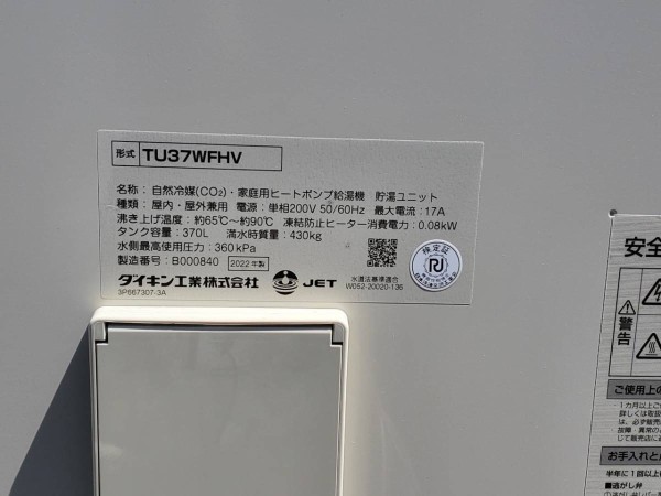 竹田市入田 ダイキン自然冷媒(CO2)・家庭用ヒートポンプ給湯機 貯湯ユニットTU37WFHV エコキュート交換工事|大分県のエコキュート専門交換工事店|大分エコキュート交換ショップ補助金対応可能