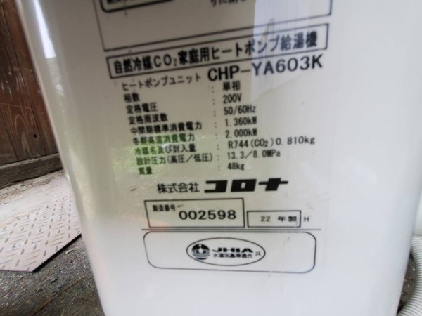 津久見市志手町 コロナ自然冷媒CO2家庭用ヒートポンプ給湯機 ヒートポンプユニットCHP-YA603K エコキュート交換工事