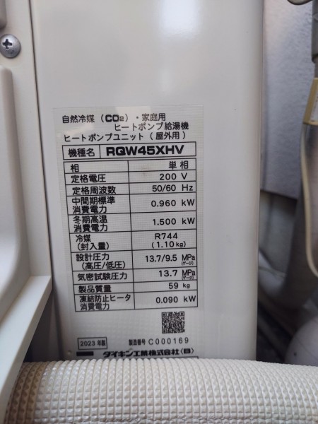 中津市三ノ丁 ダイキン自然冷媒CO2家庭用ヒートポンプ給湯機ヒートポンプユニットRGW45XHV エコキュート交換工事