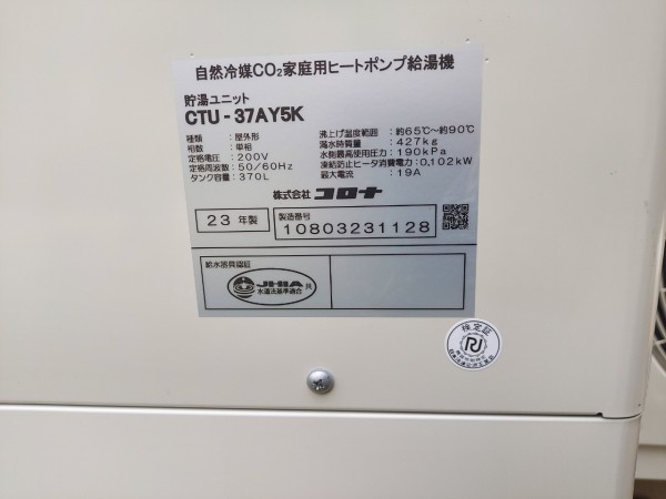 日田市有田 コロナ自然冷媒CO2家庭用ヒートポンプ給湯機貯湯ユニットCTU-37AY5K エコキュート交換工事