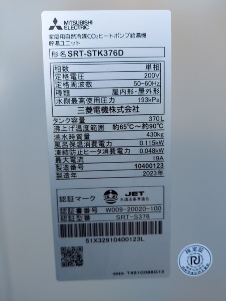 津久見市志手町 三菱電機家庭用自然冷媒CO2ヒートポンプ給湯機貯湯ユニットSRT-STK376D エコキュート交換工事|大分県のエコキュート専門交換工事店|大分エコキュート交換ショップ補助金対応可能