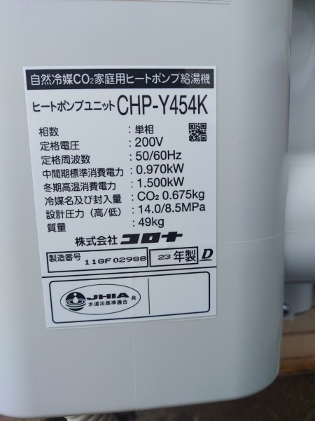 大分市明磧 コロナ自然冷媒CO2家庭用ヒートポンプ給湯機ヒートポンプユニットCHP-Y454K エコキュート交換工事|大分県のエコキュート専門交換工事店|大分エコキュート交換ショップ補助金対応可能