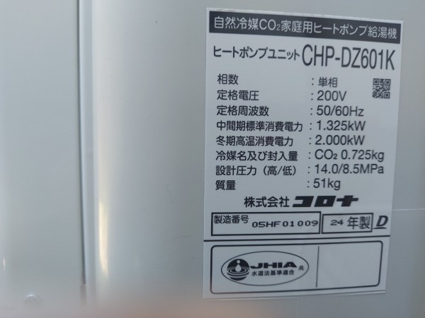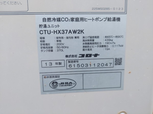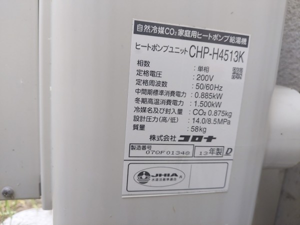 佐伯市樫野 コロナエコキュート→コロナ自然冷媒CO2家庭用ヒートポンプ給湯機ヒートポンプユニットCHP-DZ601K エコキュート交換工事