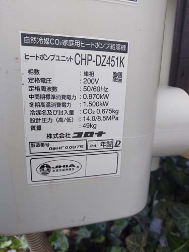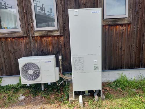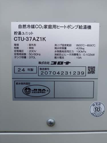 大分市明磧 コロナ自然冷媒CO2家庭用ヒートポンプ給湯機 貯湯ユニットCTU-37AZ1K、ヒートポンプユニットCHP-DZ451Kエコキュート交換工事