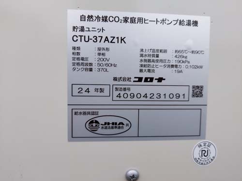津久見市門前町 コロナ自然冷媒CO2家庭用ヒートポンプ給湯機 貯湯ユニットCTU-37AZ1K エコキュート交換工事
