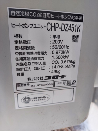 臼杵市掛町 コロナ自然冷媒CO2家庭用ヒートポンプ給湯機 ヒートポンプユニットCHP-DZ451K エコキュート交換工事|大分県のエコキュート専門交換工事店|大分エコキュート交換ショップ補助金対応可能