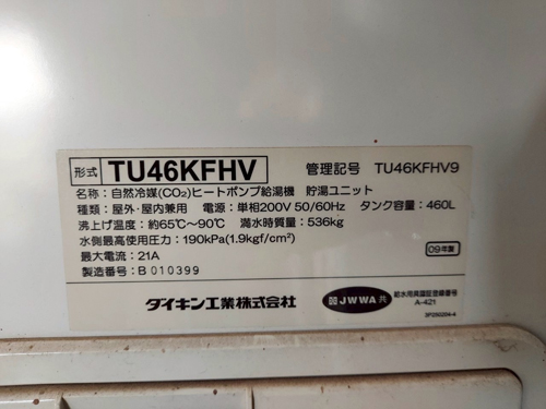 宇佐市今成 ダイキン自然冷媒CO2ヒートポンプ給湯機 貯湯ユニットTU46KFHV→コロナ自然冷媒CO2家庭用ヒートポンプ給湯機貯湯ユニットCTU-37AZ1K、ヒートポンプユニットCHP-DZ451K エコキュート交換工事