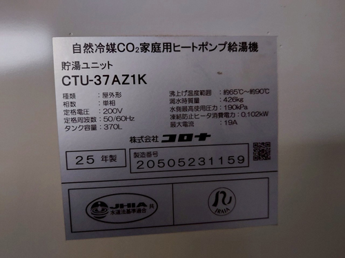 宇佐市今成 コロナ自然冷媒CO2家庭用ヒートポンプ給湯機貯湯ユニットCTU-37AZ1K、ヒートポンプユニットCHP-DZ451K エコキュート交換工事