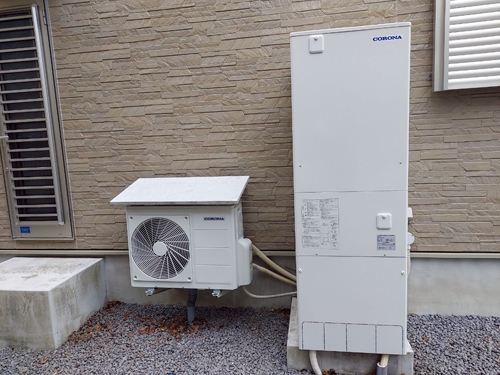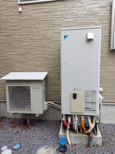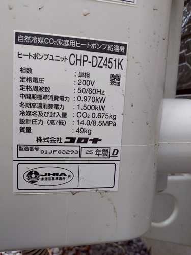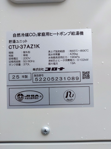 トップページ > 工事事例一覧 > 宇佐市佐々礼 コロナ自然冷媒CO2家庭用ヒートポンプ給湯機貯湯ユニットCTU-37AZ1K、ヒートポンプユニットCHP-DZ451K エコキュート交換工事