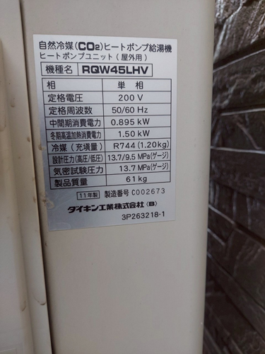 宇佐市佐々礼 ダイキン自然冷媒CO2ヒートポンプ給湯機ヒートポンプユニットRQW45LHV→コロナ自然冷媒CO2家庭用ヒートポンプ給湯機貯湯ユニットCTU-37AZ1K、ヒートポンプユニットCHP-DZ451K エコキュート交換工事