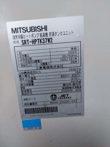 宇佐市今成 三菱電機自然冷媒ヒートポンプ給湯機 貯湯タンクユニットSRT-HPTK37W2→コロナ自然冷媒CO2家庭用ヒートポンプ給湯機 ヒートポンプユニットCHP-DZ451K エコキュート交換工事