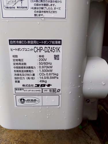 宇佐市今成 コロナ自然冷媒CO2家庭用ヒートポンプ給湯機 ヒートポンプユニットCHP-DZ451K エコキュート交換工事|大分県のエコキュート専門交換工事店|大分エコキュート交換ショップ補助金対応可能